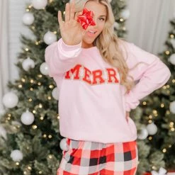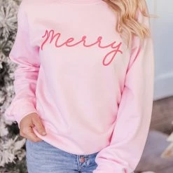 Budget ✨ Pink Lily Merry Script Light Pink Graphic Sweatshirt 😀