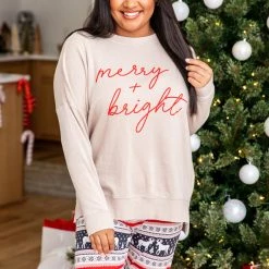 Best Sale 🥰 Pink Lily Merry & Bright Script Light Tan Graphic Sweatshirt ✨
