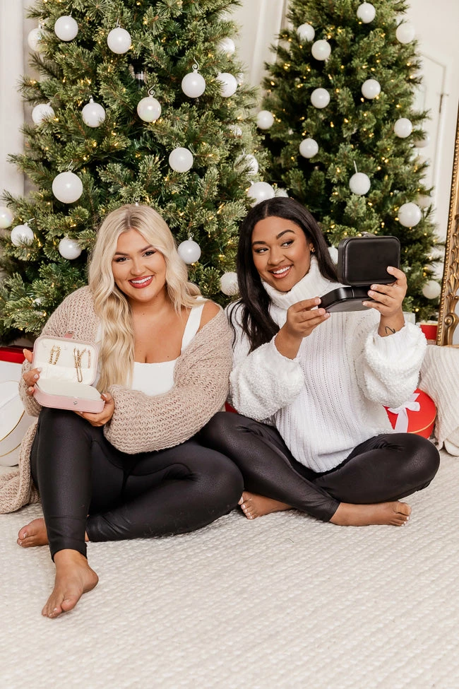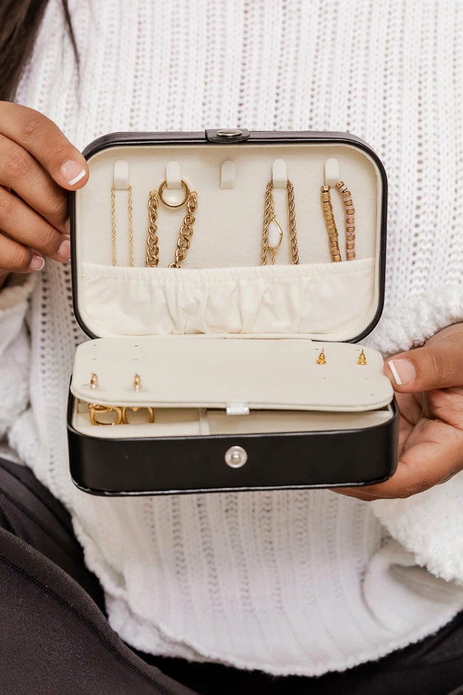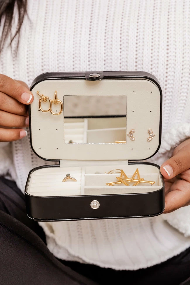 This cuteΒ black jewelry case is perfect for all your necessities! It features a zipper closure and compartments on the inside to hold all your jewelry when your on the go. Plus it’s the perfect travel size for any weekend trip!Β