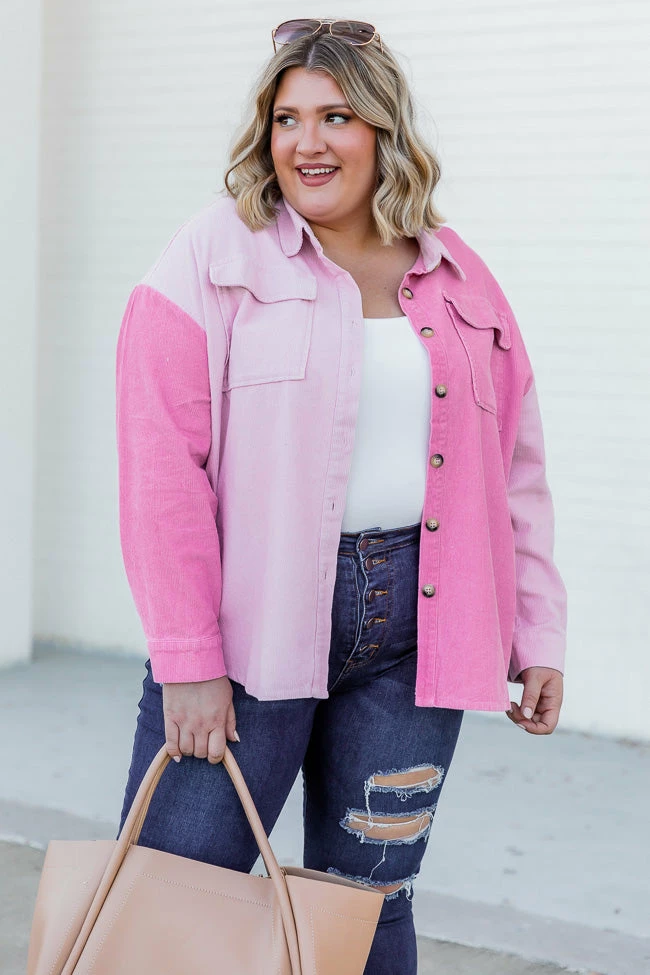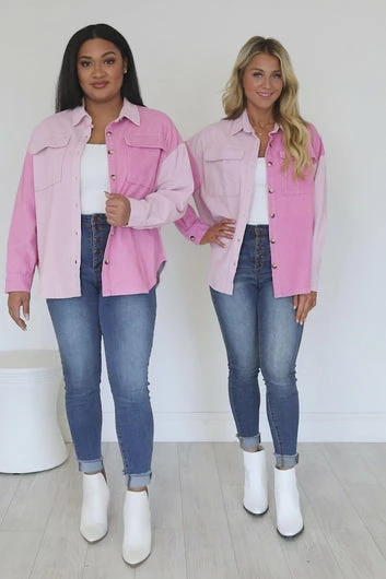 - Long sleeves with a button up front, double pockets, and contrasting colors