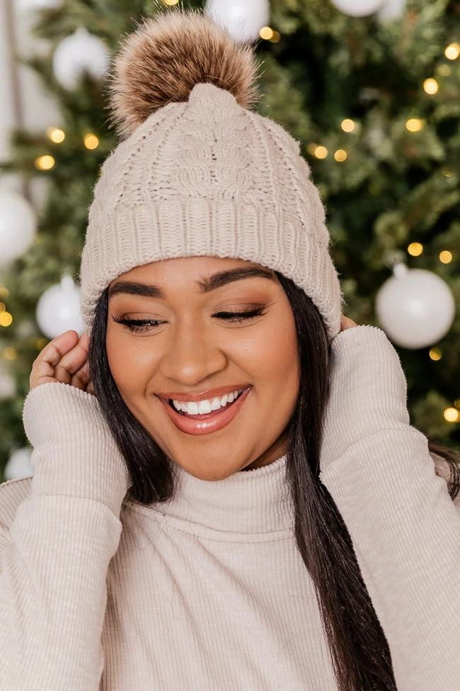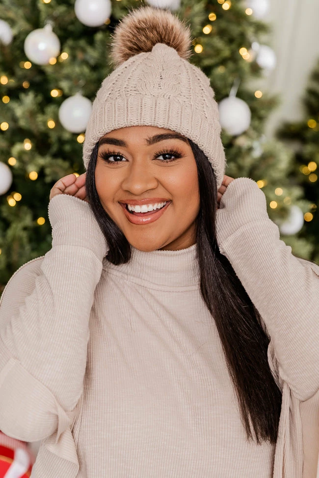 - Folded hem with cable knit pattern and fuzzy pom detail