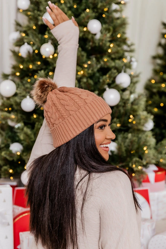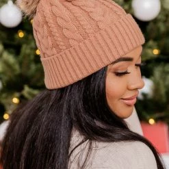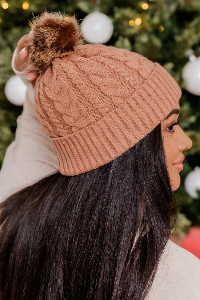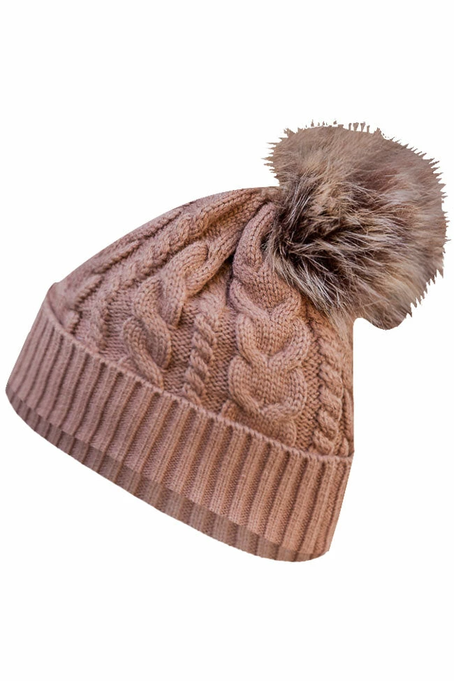 - Folded hem with cable knit pattern and fuzzy pom detail